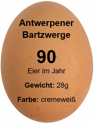 | Die Rassetypischen Merkmale der Antwerpener Bartzwerge sind der Bart, der aufrechte Gang mit der nach vorne gewölbten Brust, gesenkten Flügeln und einem mähnenartigen Halsbehang. Das breit gebaute, lebhafte Zwerghuhn wirkt gedrungen und putzig. Erfahrene Halter dieser Zwerghuhnrasse erklären, dass Antwerpener Bartzwerge selbst auf wenig Fläche artgerecht gehalten werden können. |