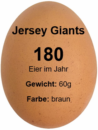 | Das Jersey Giant ist im weltweiten Vergleich das größte Huhn und stammt aus den USA. Es ist ruhig, flugunfähig und eignet sich für Fleisch- und Eierproduktion. Mit entsprechender Zuwendung wird es sogar zahm. Aufgrund der Körpergröße hat das Riesenhuhn einen erhöhten Platzbedarf. Im Vergleich zu einem mittelgroßen Huhn braucht das Jersey Giant ca. ⅓ an Bewegungsfläche mehr. |
