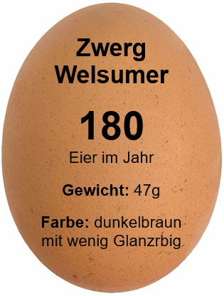 | Zwerg-Welsumer sind sehr lebhafte Landhühner, welche robust gegen Kälte und sehr neugierig sind. Sie beeindrucken durch eine sehr gute Legeleistung und erstaunlich hohes Eigewicht. |